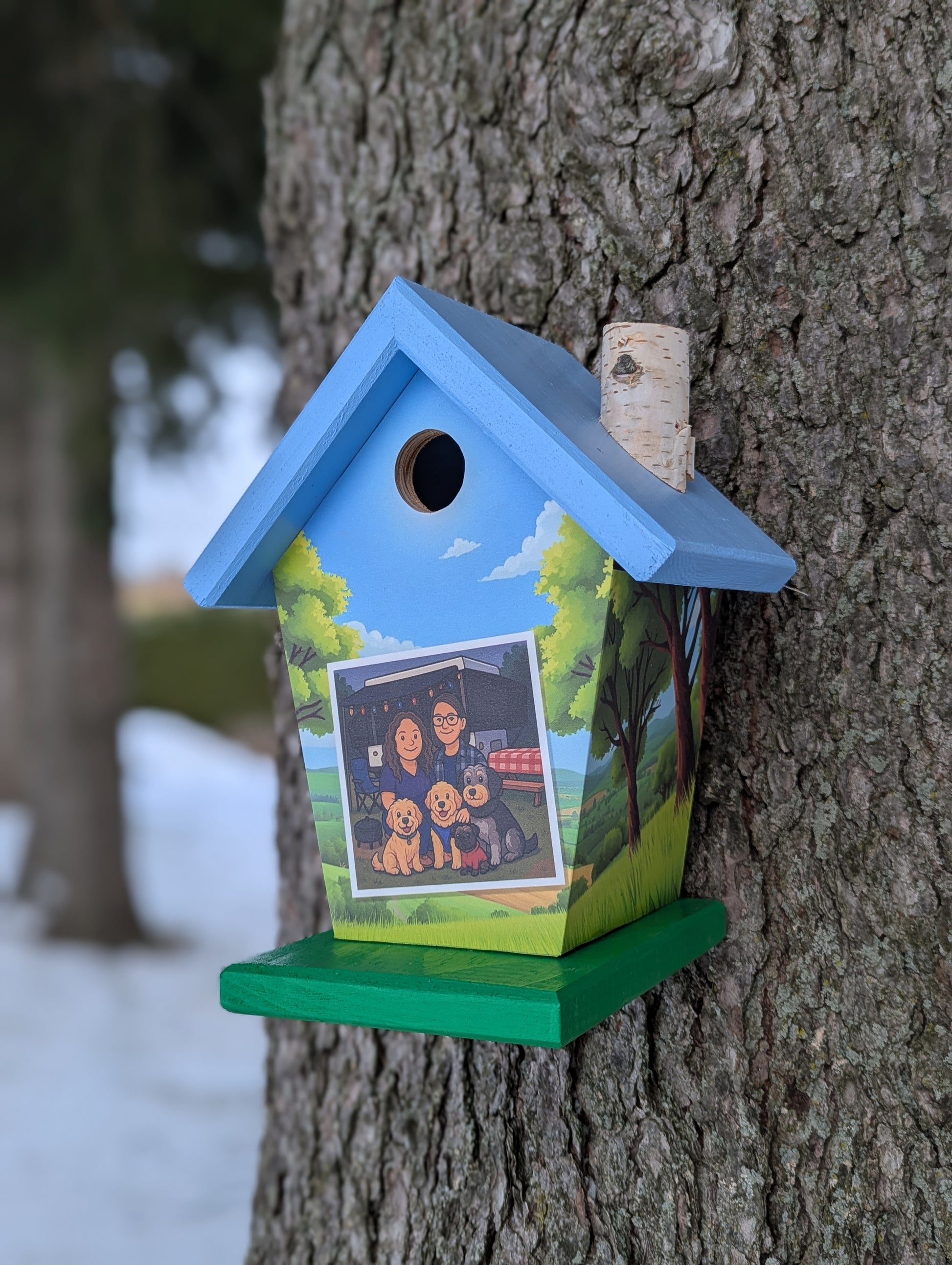 All of my birdhouses are personally hand-built with 1/2" signboard (Plywood). My roofs and bases are 3/4" Clear Pine. They are glued and nailed. I wrap the houses with vinyl and apply a clear laminate. This birdhouse is wrapped on 3 sides, for mounting on a tree or fence. (the back is exterior MDF unfinished) You have the option to have this as a hanging birdhouse, wrapped on all 4 sides. It can also be mounted on a pole. Please specify when ordering which you prefer. Four sided wrapped birdhouses cost $75.00. If you wish to order the 4 sided birdhouse, message us and we will send you the link. Great for indoor or outdoor.