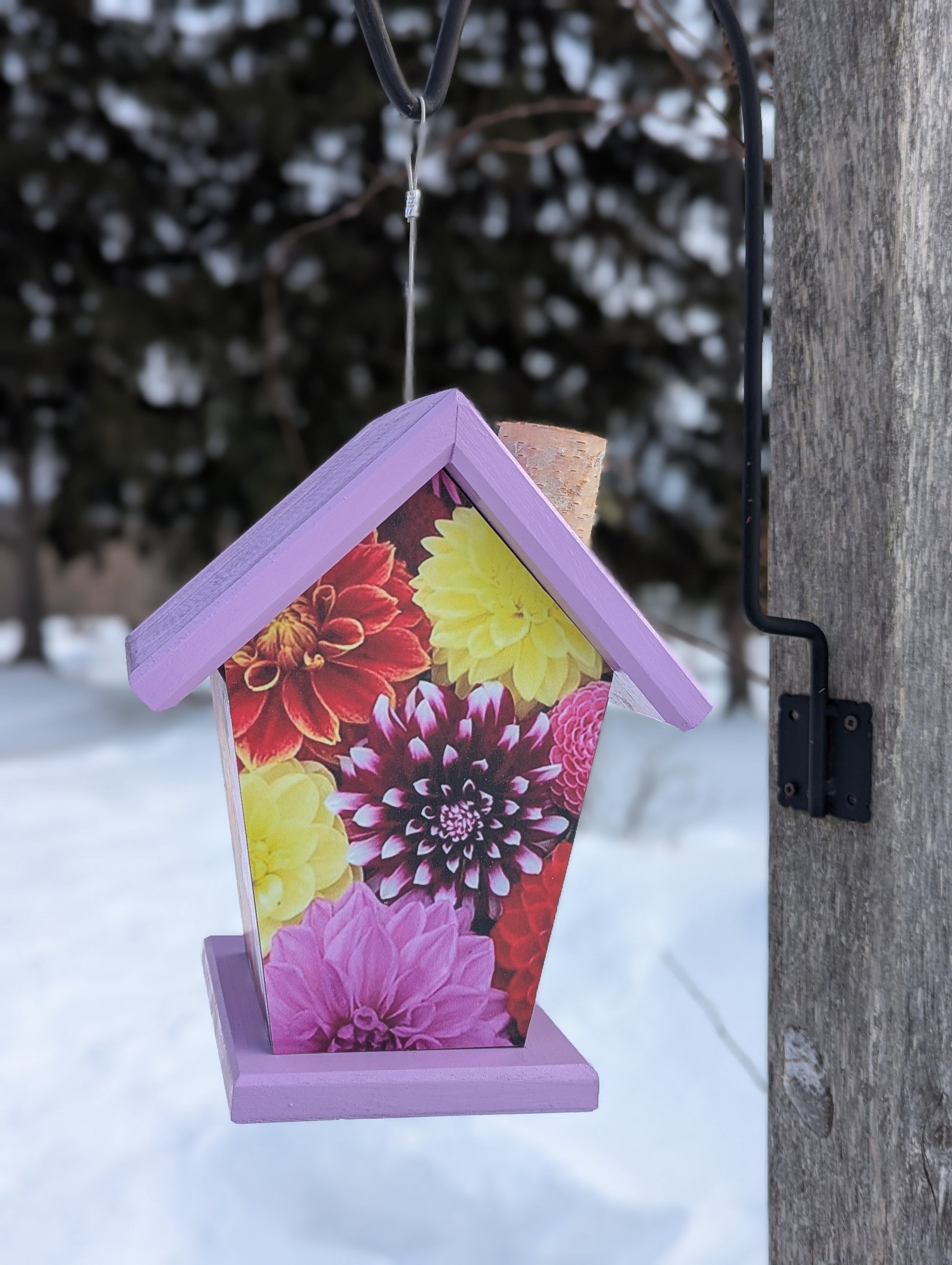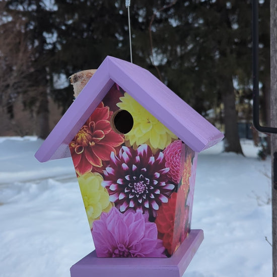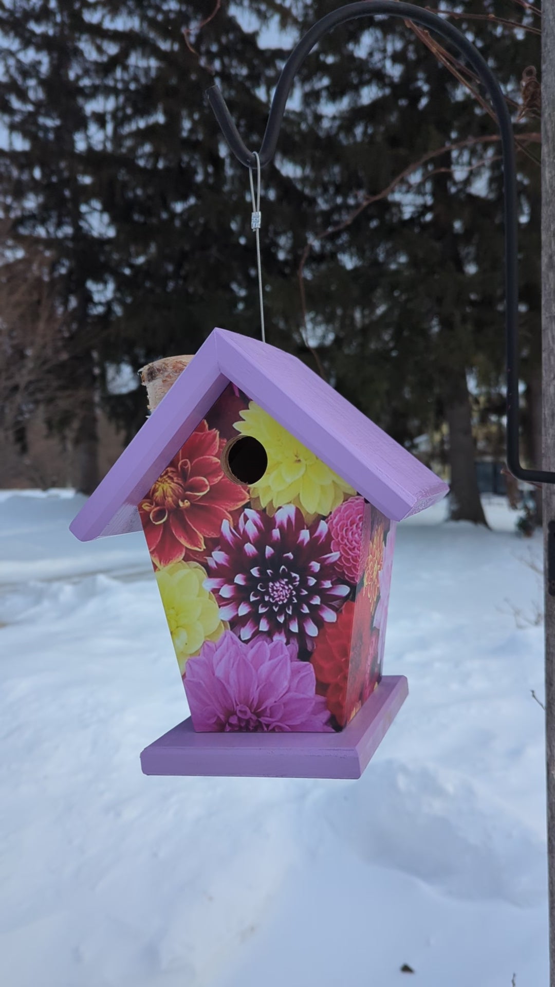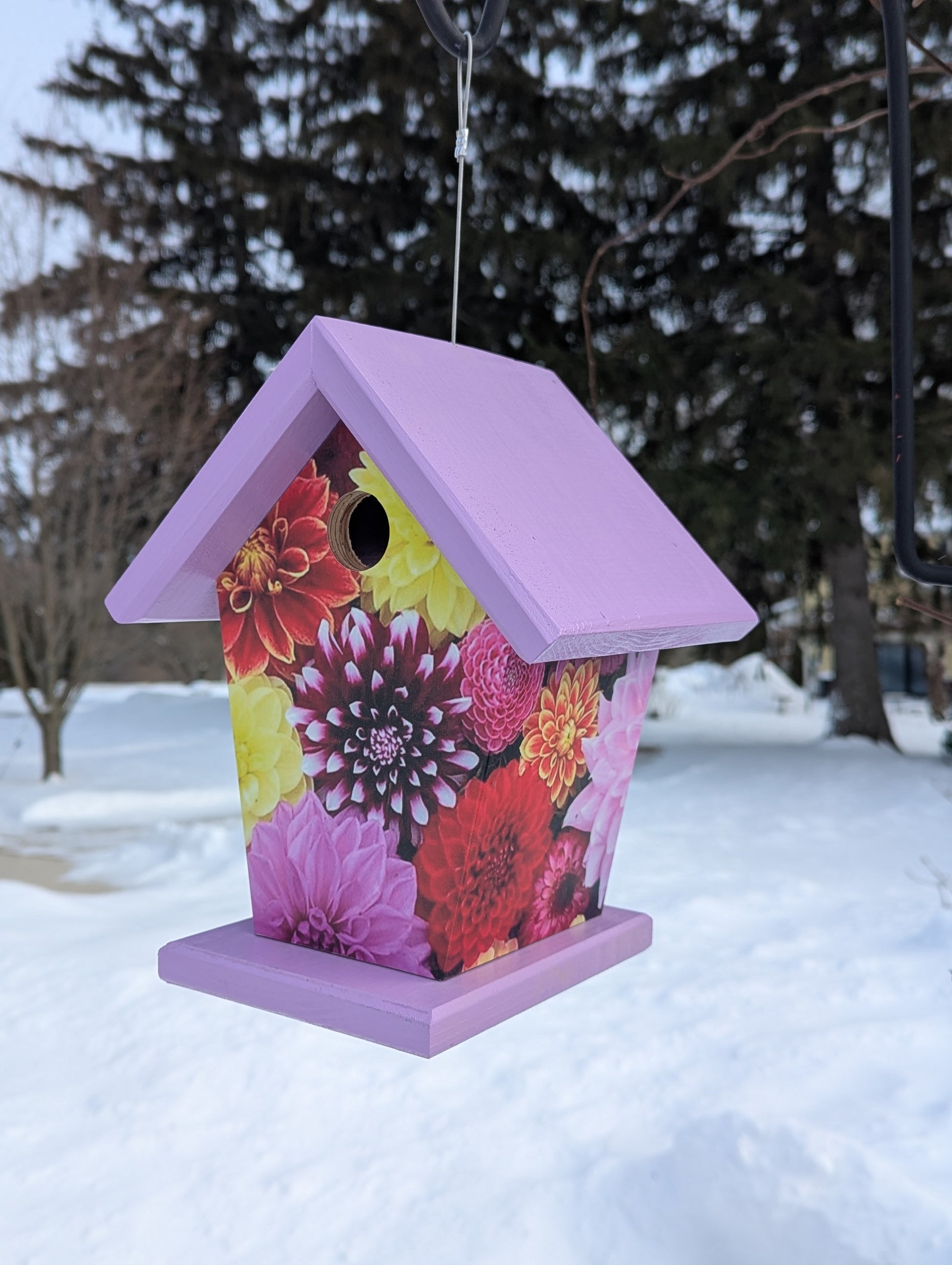 All of my birdhouses are personally hand-built with 1/2" signboard (Plywood). My roofs and bases are 3/4" Clear Pine. They are glued and nailed. I wrap the houses with vinyl and apply a clear laminate. This birdhouse is wrapped on 3 sides, for mounting on a tree or fence. (the back is exterior MDF unfinished) You have the option to have this as a hanging birdhouse, wrapped on all 4 sides. It can also be mounted on a pole. Please specify when ordering which you prefer. Four sided wrapped birdhouses cost $80.00. If you wish to order the 4 sided birdhouse, message us and we will send you the link. Great for indoor or outdoor.
