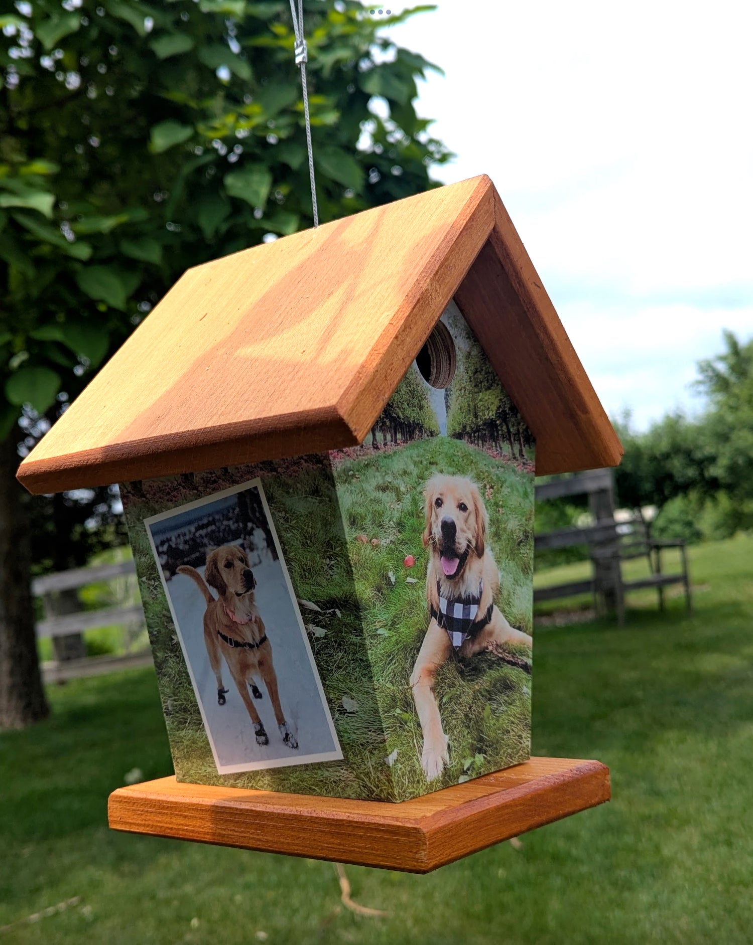 All of my birdhouses are personally hand-built with 1/2" signboard (Plywood). My roofs and bases are 3/4" Clear Pine. They are glued and nailed. I wrap the houses with vinyl and apply a clear laminate. This as a hanging birdhouse, wrapped on all 4 sides. It can also be mounted on a pole. Please specify when ordering which you prefer. Four sided wrapped birdhouses cost $75.00.Great for indoor or outdoor.
